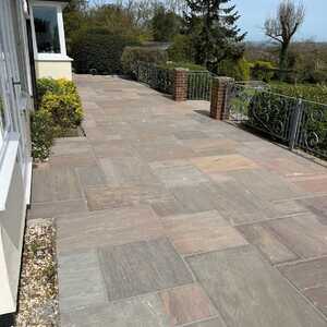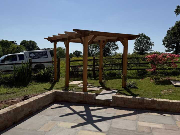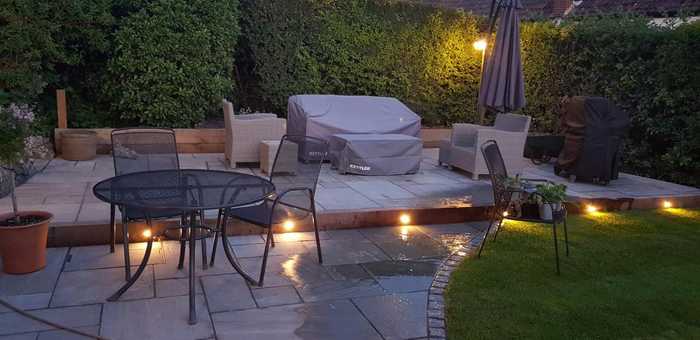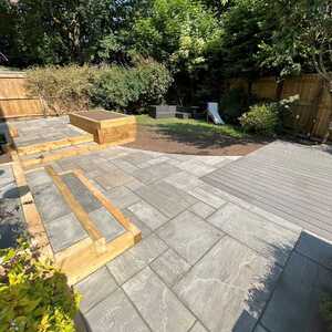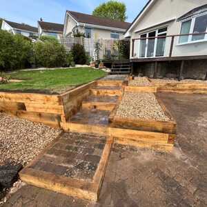 Patio area and raised bed using oak sleepers installed.